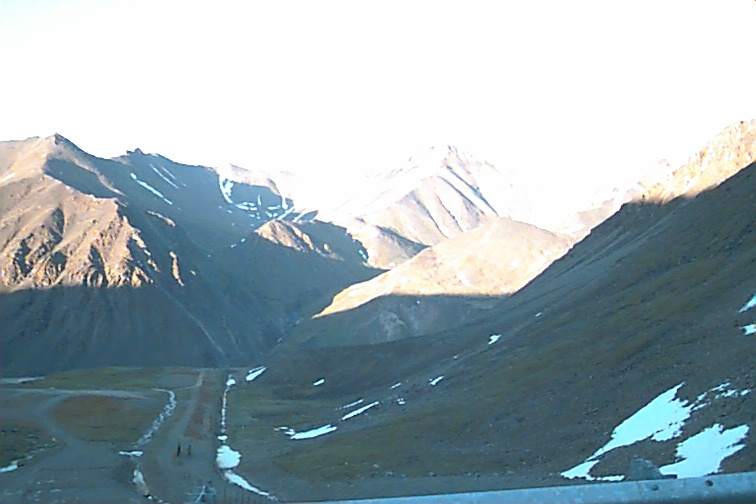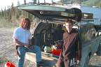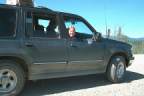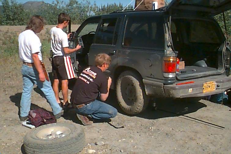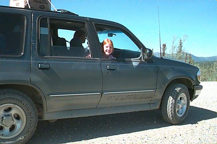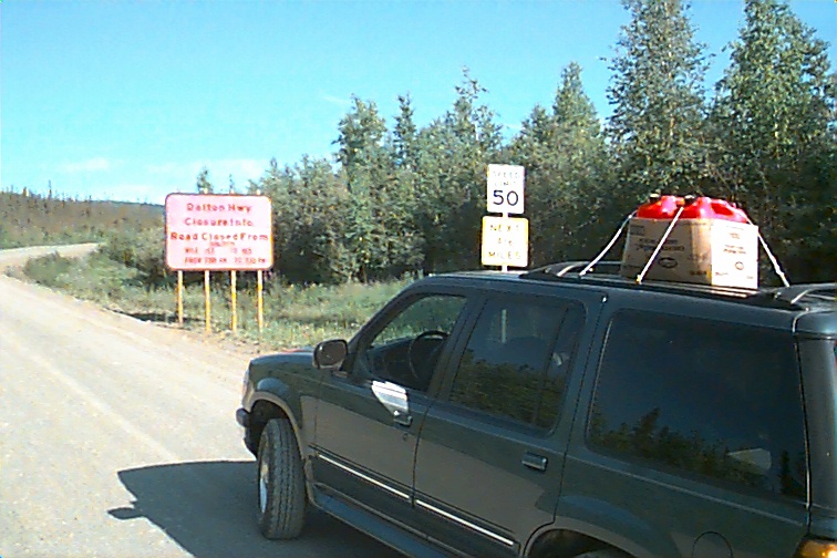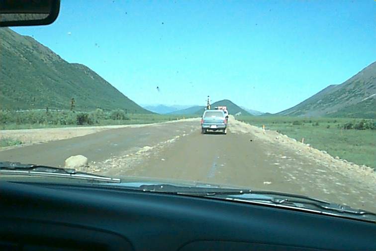 These are just some pictures along the way on our first day. The two fellas by the car are from California. Mario (Dad) is on the left and Emanuel on the right. Emanuel is 18 and is riding a mountain bike from Prudhoe Bay to the tip of Argentina. He had ridden about 101 miles to Happy Valley (nothing there any longer - used to be a construction sight) He fused a back wheel and had to stop. They drove back to Fairbanks and bought another bike (then found they could fix that one as well). They were driving back to Happy Valley to officially start again. When we caught up with them they had had three flats. They helped us with our first and we followed each other into Coldfoot and had our tires repaired at the same time. We planned to eat there and then start back out. It turned out that a back hoe had cut the electricity and they were without... No cash registers, no gas pumps, no lights in the restrooms. SO.... we were there about three hours waiting to get gas. There are no other services the rest of the way. We had ten gallons on the roof but that would have been a little risky so we waited. That was the clincher to not making the trip in 12 hours. We think that would be pretty impossible anyway. Our time would end up being about 18 hours each way. (Don't forget besides flats and waiting for gas - we stop for ALL animals!)