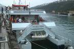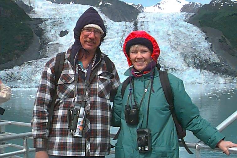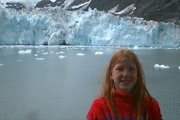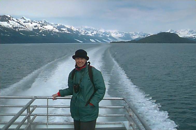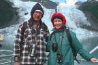 We made several stops along the way and got up as close to the glaciers as possible. We "hung out" there awhile to watch the calving. That's where pieces "are born" and drop off into the water. There is thunder first which lets you know some movement is taking place but you never know where and have to be looking. The huge pieces of ice fall in and create waves or splashes depending on size. Then you heard the sound again as it echos on the other side. We posed Stacey out here for a picture to prove she was here. She doesn't much want to brave any elements no matter how pretty it is. She chose to spend most of her time tucked inside. She may not even be aware of what her choices allow her to miss.