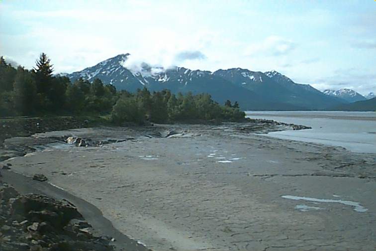 This first view here is of mudflats along the way heading out of Anchorage. We've heard big stories of bore tides coming in and drowning folks that were stuck in the mud. It kind of sucks you down into it the more you move around. The tides can be up to forty feet or such. Sounds unreal to me.