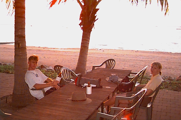 When we get back from this trip Andrew will be heading back to Adelaide for his sea kayak trip and Jane and I will move on to Cairns (pronounced cans). Perhaps we will slow down and get a little rest. I just changed batteries in the digital camera so they would last for the next 3 days and 48 pictures. I don't take the laptop with us on the safaris. I have already made arrangements to store it in the safe here at the backpackers hostel that we are staying in. Our big packs go in a storage room. This place isn't as nice as where we were staying in Alice. The bathroom and showers are down the hall (as they are in all the backpackers hostels like we are staying in). There is just one set for everyone so there is no use bothering to close the doors. You never know if the person in the shower or head next to you is a man or a women unless you happen to come out at the same time. We found a little international phone shop to finish transmitting the last batch of pictures. It is expensive long distance calls so we haven't been able (willing) to test the web site. I think my 240 volt adapter is giving up but I have Andrews that he uses with his camcorder. Jane has gotten all kinds of email from all over about the web site (positive feedback). Everyone on our tour took the URL so they could get it to their parents and friends. Looking forward to seeing the tropical rain forest and all the birds and critters. Can't believe it is already day ten. We walked our butts off when we let Andrew be point man. I think we did about 10Ks. We finally ended up calling a hire (cab) when we realized we were another hour back to the hostel. The cab driver told us about a private club right on Darwin Harbor that was a good place to eat and watch the sunset. We had a XXXX beer and a great meal while watching the sunset through the coconut trees and over Beagle Gulf. |