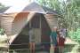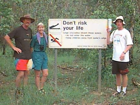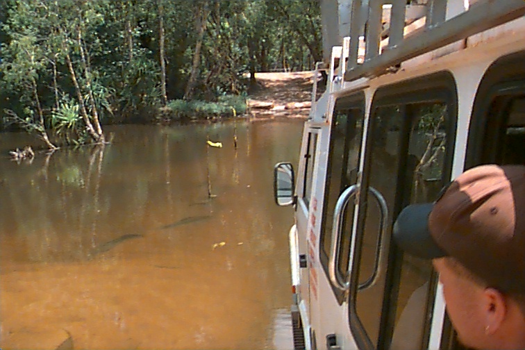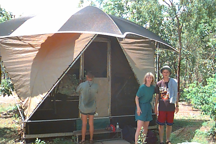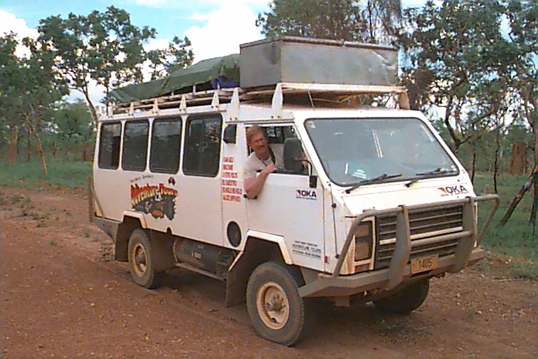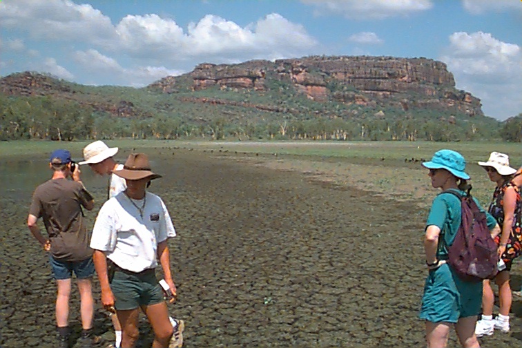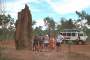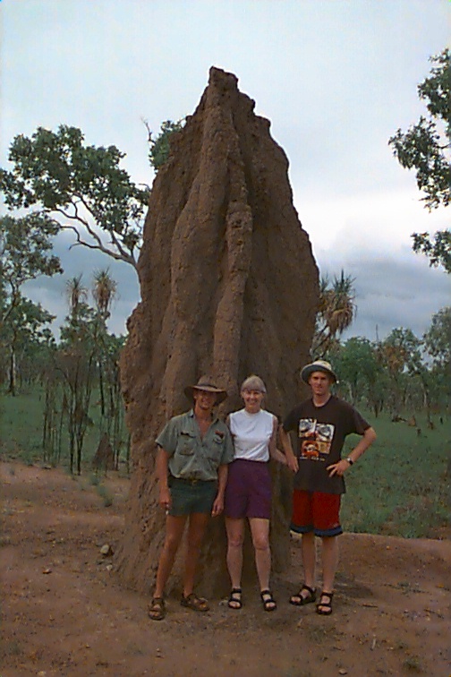 We only saw a few other people today. Three came into the falls area while we were there. On the swim out we passed three small canoes of folks taking the easy way in!! That was it. What a treat of an experience. From there we left to drive to Jim Jim Falls. They are totally dry now so not as scenic as they will be later. The pools are filling up at top so it shouldn't be much longer. Jim Jim cannot be accessed once the rains start though. We went over two rivers about a meter deep to get there now so soon that won't be possible. Jim Jim can only be seen then from the air. It was HOTTER than hot about the time we were there so we didn't stay too long. The pool at the base was very exotic. Lots of palms etc. We had a lot of that 4WD territory to cover again today getting out of where we were. That was interesting! We went back to our camp and loaded up. Had time for a 30 minute cool-down in the pool and then got back on the road. We had 350 K to do today..... We headed back toward Darwin. We stopped at one spot to look at the Cathedral Termite mounds we had been seeing from the road along the way. They are mammoth in size. Maybe two to three meters above ground and a third of the nest is underground. They are waterproof, fireproof and 4WD proof!! They actually feel like concrete. These termites don't eat wood... they eat more grass than all the cattle and sheep in the country!! These cathedrals might be 50 years old filled with 2,000,000 termites. There are all kind of termites here. The flood plain termite mounds are pointed and shorter by far. There are tree tunnel termites and even "magnetic" termites. There nests are tall like the cathedrals but very thin and face north - south. Back in Darwin, we cleaned up for dinner and joined the group in the center mall at the Victoria Hotel. I'd had an allergy attack of some kind today and the cigarette smoke there shut my evening down. The "old" folks went back to turn in and let the young folks "pub" it. I think Andrew came in about 2:00 a.m. He's enjoyed meeting these kids from all over. We're collecting a list of addresses. I imagine I'll have a few house guests at some point!
