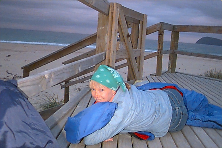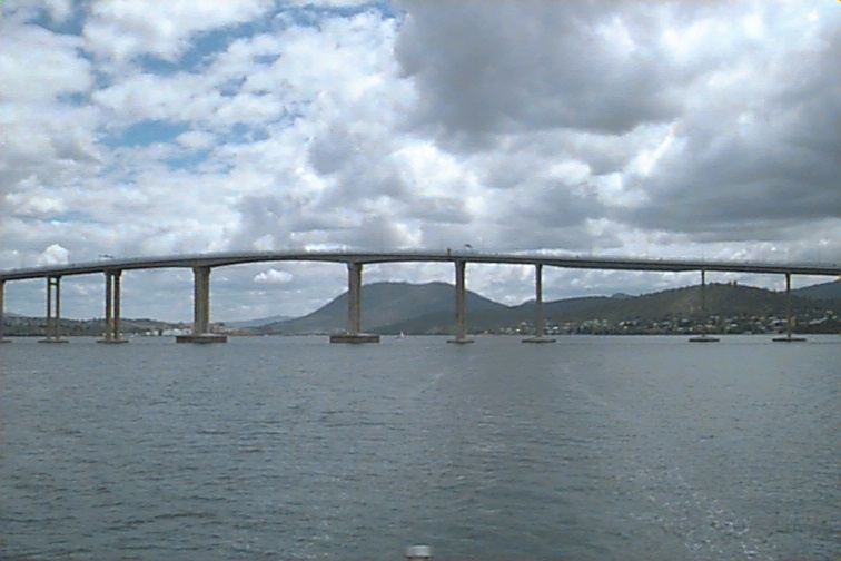As the day evolved, we realized we would just not be content if we did not return to Bruny Island to see the Fairy Penguins! We stopped at the Visitor Information Center in town on our explorations and got information about hiring (renting) a car and getting the ferry schedules. We decided to take the last ferry over to Bruny Island which was 6:30 p.m. The car rental man came to pick us up and took us into the office for us to do the paperwork. This was a highly orchestrated plan. We could only have the car for 24 hours or less. Our plan was to take the first ferry off the island at 8:30 a.m. tomorrow and drive back through Hobart and out the other side to Maria Island to catch the first ferry over there at 10:30 a.m. where we want to spend tomorrow. If we miss that ferry the next ferry wouldn't be till 1:00 p.m. and not so worth taking. We would take the 4:00 p.m. ferry off (last one), drive back to Hobart and get the car turned in. No room for errors here!! We made this first ferry in the link!! We hung out on the beach waiting for dark. We had the beach to ourselves for hours. We had explored the cliffs before the penguins came up. Coming in the first thing we had found was a huge black snake. We only saw a part of it. When we startled it, it fully slithered into one of the penguin nests. Yuck!! We looked at shells on the beach and checked out where most of the penguin tracks were. We just laid out on the wooden stairwell and chilled. Once it looked like dark...... it was another two hours before it was!! Fooled us.... was really close to 9:30 before it was dark enough for them. A few other folks had joined us by this time.... I think there were a total of ten of us there. We realized then how late it would be when we got through and we hadn't gone by the hostel first!!..Maybe we'd be sleeping on the beach! This place has FEW accommodations - all of which are at someone's house or such. Rusty had his night scope and that really helped spot the penguins coming in. It finally was just too dark to see far. They seemed to come up in little groups and most came up the same path in the area where we were..... they just scrambled up and all over that hill. All those holes even down the other side and into the parking lot had residents! I was surprised how small they were. They were no bigger than a small duck --- maybe similar in size to a two liter coke bottle it that helps.... not quite that tall. I could talk for hours about the evening. It was so fascinating!! The Short-tailed Shearwaters came in right at dark also and they were nested throughout the area as well. They get their name from their graceful shearing flight moving from centimeters above the water's surface to high in the sky. Some of the folks were calling them "Muttonbirds". An officer in the Royal Marines called them 'the flying sheep' so this nickname has been applied to them since. We probably went nuts trying to take pictures of the penguins! It was like "shooting in the dark" - but we had to try. The cam-corder wouldn't pick up anything but the sound! We were the last to leave the beach!! We headed down the island to find the hostel not really expecting much since it was 10:30pm! We saw one house that still had lights on. We found the one pay phone near the teahouse we'd had lunch in the other day and called. Our luck was with us! - it was the house with the light on!! Boy, did that suit me!! There was only one young gal there in the area we stayed. We had seen her on the ferry the first time we came over. We hit the hay about 11:00 p.m. and had the clock set for 6:00 a.m. Sleep would be good. This experience was a highlight for us! Hobart Bridge