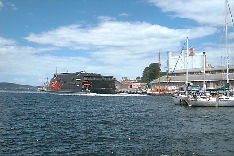 Hobart is a pretty city and much more laid back..... conservative and non-assuming. It's so quaint, which is pretty much true of old Harbor towns. There are several wooden ships parked in the Harbor dating to the 1800's. It's always interesting for Rusty to check out the MV's (marine vessels). Rus was just mesmerized by the Devil Cat which is in the Harbor now. It will be making the run from Melbourne. _____________ Jane left this blank for me to fill in info about the Devil Cat. I think I was right on the edge with Jane trying to get a look at the boat. The boat was built here in Hobart. It is 96 meters long and cruises over 50 knots! It has 4 jet pumps and is powered by turbine engines that produce 40,000 horsepower. It can carry 900 people and 250 cars. Total cargo capacity is 800 tonnies. It is painted black with Tasmanian Devil markings. Wicked looking.