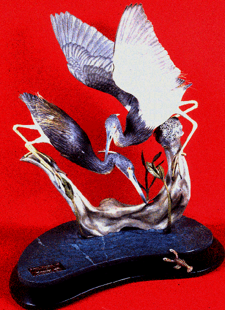 Tri-colored Herons ready to eat a hand-carved Crayfish. Carved in 1996. Base is soapstone and wood. Purchased privately.