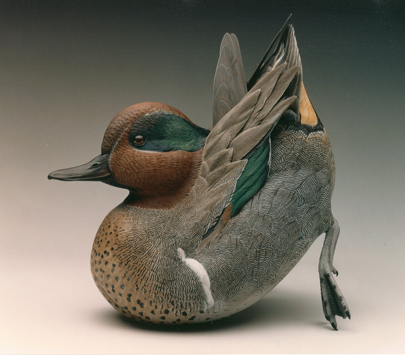 By this time his challenge had moved on to creating larger decorative sculptures of full-bodied waterfowl interacting in flight. He also incorporated stone, metal, glass and Lexan into his unique compositions.