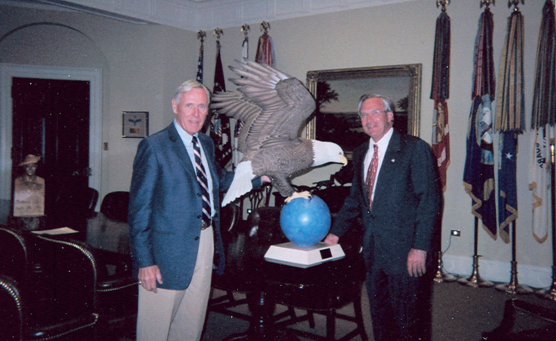 President George W. Bush, Jim Sprankle and the Honorable Porter Goss (US Rep FL) share a moment in the oval office of the White House. At this time "Freedom Fighter" was presented to the President as a gift from a group of Sanibel and Captiva Island citizens in commemoration of the 100th anniversary of the founding of the National Wildlife Refuge System.